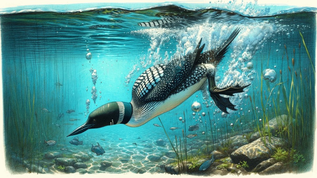 Underwater, the loon is an agile predator. Its body, streamlined for minimal resistance, allows it to twist and turn with remarkable agility. Eyes adept at adjusting to the refractive differences underwater spot fish with deadly precision. Once a target is sighted, the loon uses its strong chest muscles to propel itself forward, capturing the fish with its sharp beak.