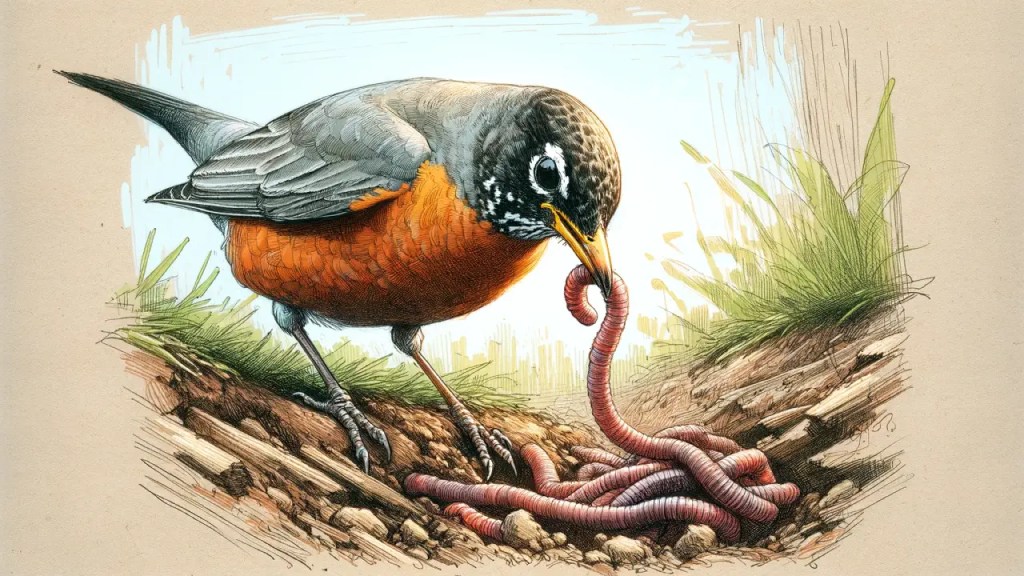 It’s a common belief that robins listen for earthworms when tilting their heads. While their vision is sharp for spotting worms, the head tilt is actually to use both eyes to get a better view of the ground and detect the slight movements of their prey.