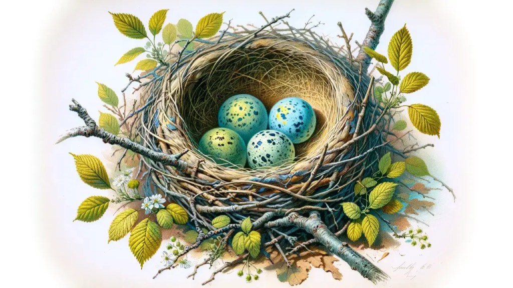 The female takes the lead in constructing the nest, which can take up to ten days. The structure is tidy and cup-shaped, made of grass, twigs, and bark strips, and lined with softer materials such as feathers, hair, and fine grass. This design provides a sturdy yet comfortable place for the eggs and chicks, ensuring warmth and protection.