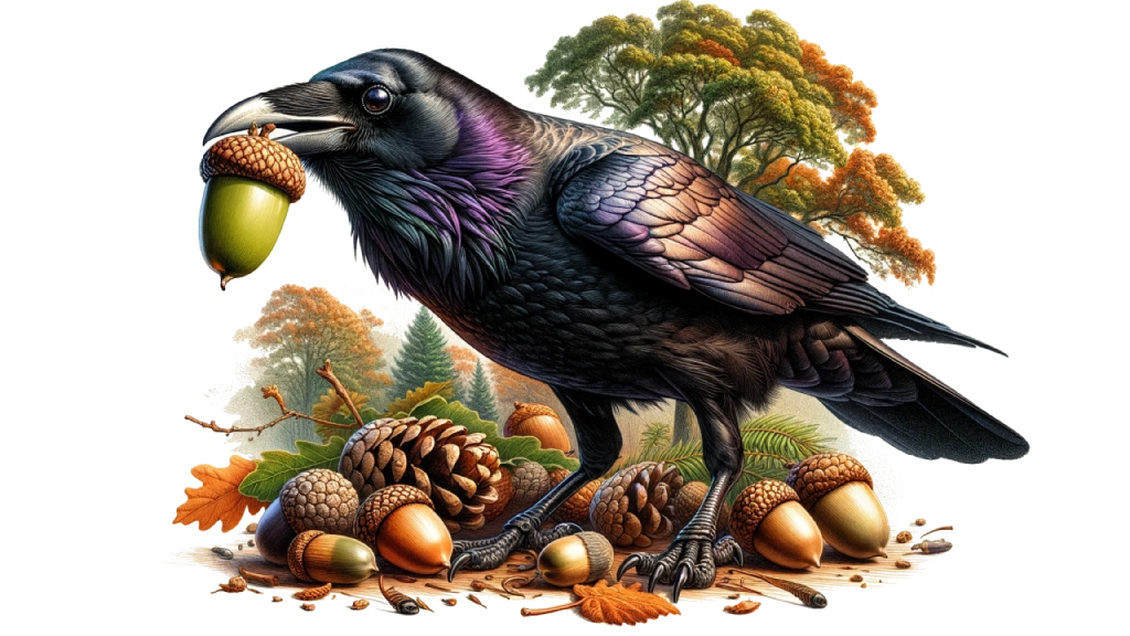 The crow’s diet also changes with the seasons. In autumn, they shift to consuming more nuts and seeds, such as acorns and walnuts, which are abundant. This helps them build up fat reserves for the winter. During colder months, their ability to exploit human-associated food sources becomes even more crucial as natural food becomes scarce.