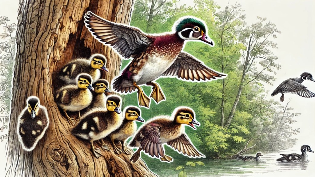 One of the most remarkable moments in a Wood Duck’s life is the ducklings’ first leap from the nest. Just one day after hatching, the ducklings, covered in fluffy down, bravely jump from the nest cavity, which can be up to 50 feet high. This leap of faith is a critical step towards reaching the safety of water. Despite the height, the ducklings are resilient and are rarely injured during this fall. Guided by their mother’s calls, they make their way to the nearest body of water, where they will continue their development.