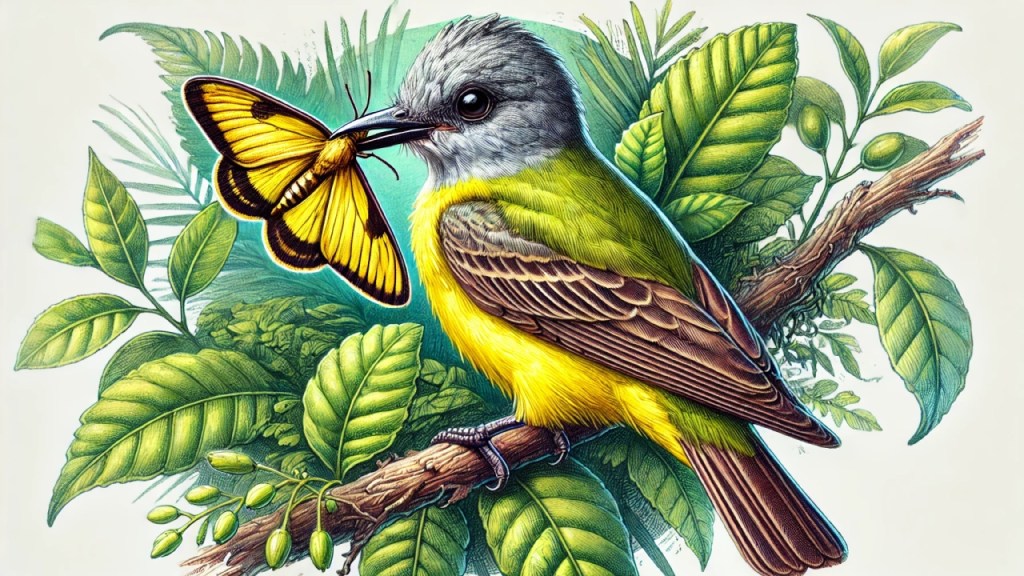 Insects make up the bulk of the Tropical Kingbird’s diet. These birds are skilled aerial hunters, catching insects on the wing with impressive agility. Common prey include flies, beetles, grasshoppers, and dragonflies. The Tropical Kingbird often perches on a high, exposed branch, scanning the surroundings for potential prey. Once an insect is spotted, the bird takes off in a swift, acrobatic flight to snatch it mid-air. This behavior is known as “hawking,” and it is a common feeding strategy among flycatchers.