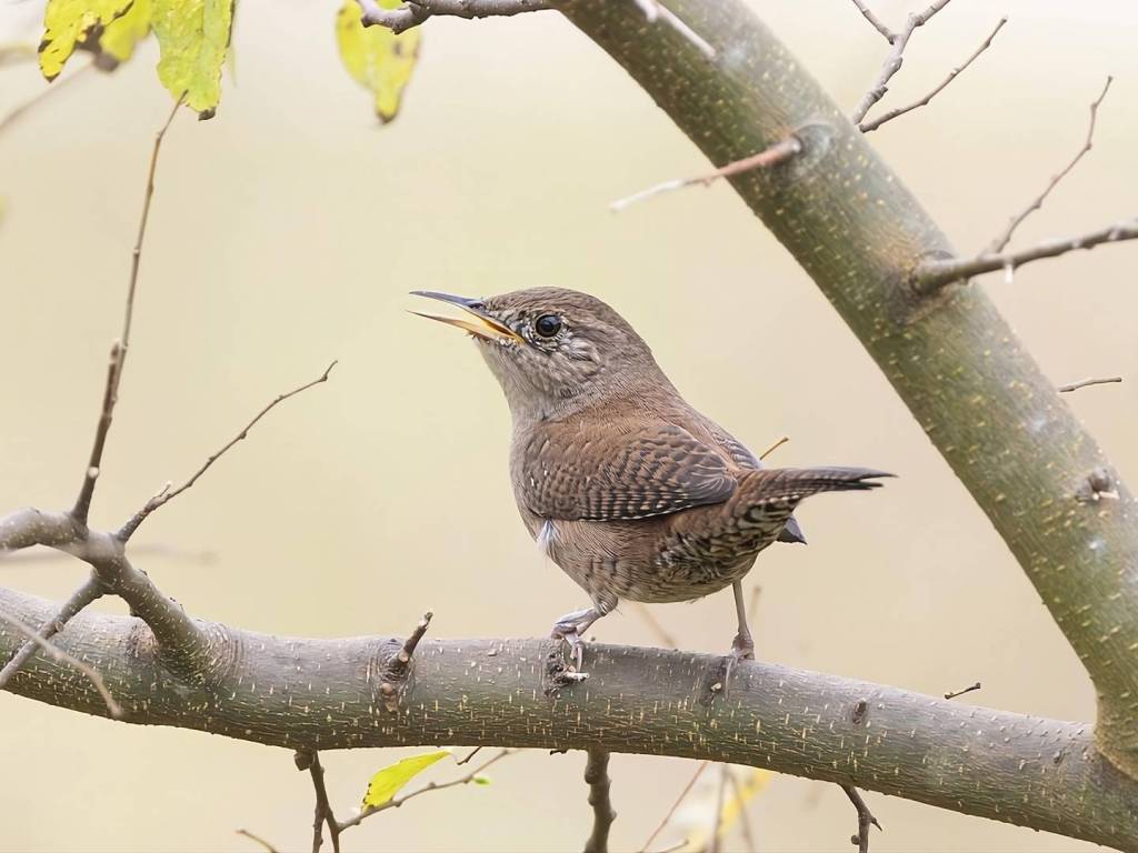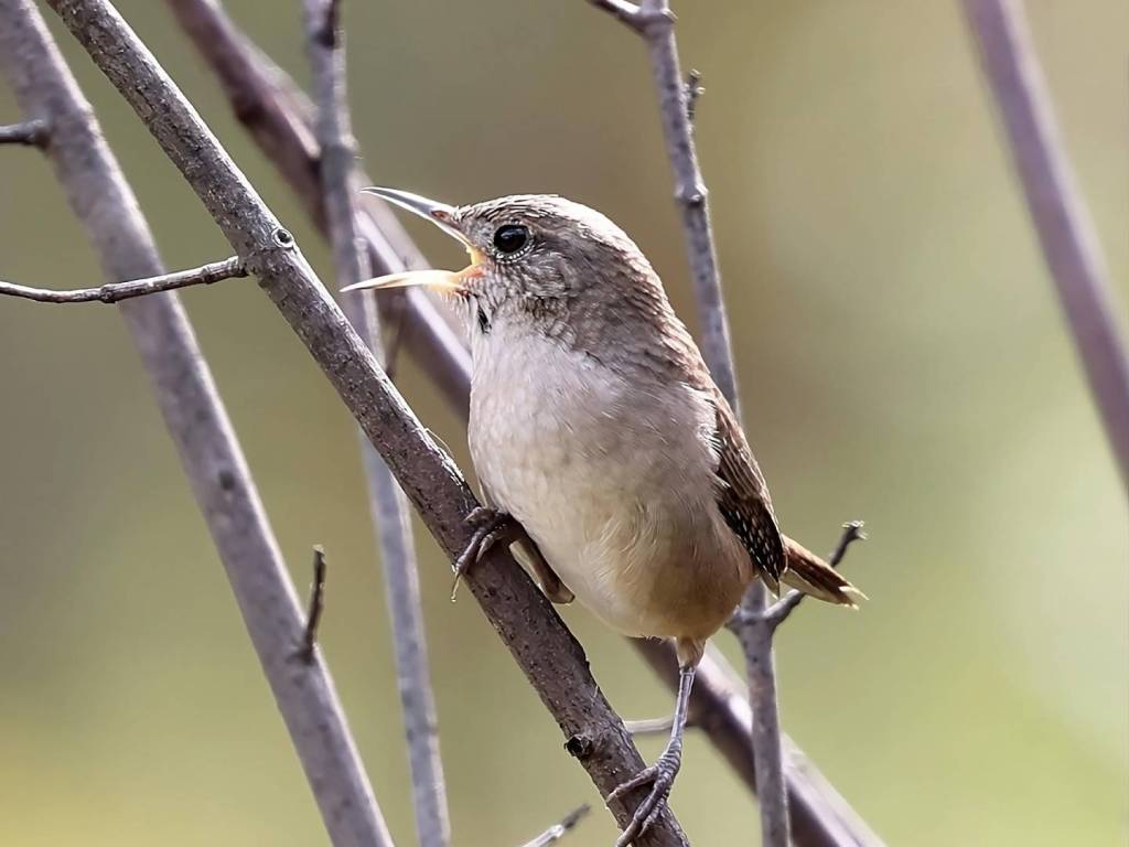 The House Wren has a slender, slightly curved beak, perfect for snatching up insects. Its beady, dark eyes gleam with curiosity, giving it a sharp and alert look. These features are crucial for survival, helping it detect and capture prey efficiently.