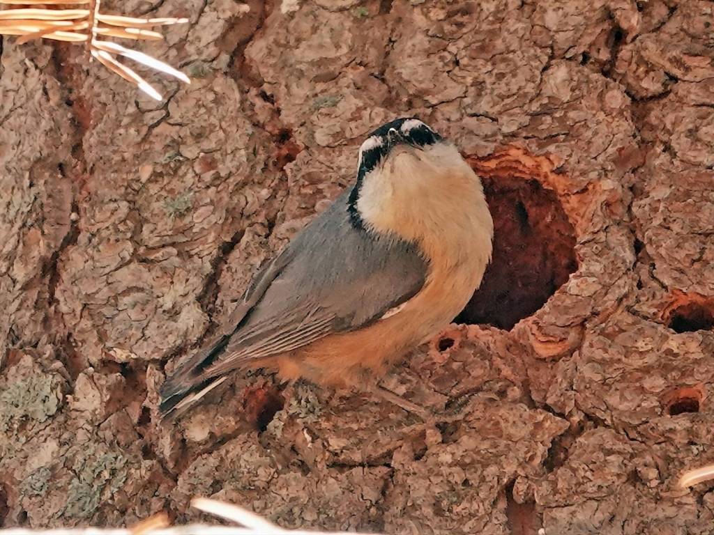 - Upside-Down Foragers: Red-breasted Nuthatches are known for their unique foraging style. Unlike most birds that climb upward, nuthatches often work their way down tree trunks headfirst. This way of feeding helps them spot hidden insects and food sources that other birds might miss.