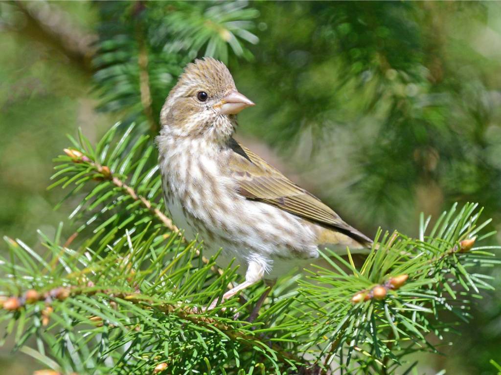 Now, the female Purple Finch is a whole different story. She doesn’t have any red at all. Instead, she sports a more subtle look with brown and white tones. Her upperparts are light brown, and her underparts are white with sharp, dark brown streaks running down her chest and sides. One standout feature? That crisp white eyebrow stripe—called a supercilium—sits right above her eye and gives her a fierce little expression.