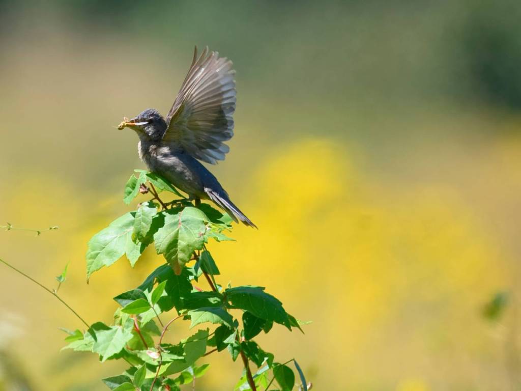 Once the nest is ready, she’ll lay a clutch of 3 to 5 eggs, which are a pale blue color. She then incubates the eggs for 12 to 13 days, rarely leaving the nest except to feed quickly. After hatching, the chicks are completely vulnerable—they have no feathers and their eyes are shut. Both parents feed them a steady diet of insects to help them grow fast.