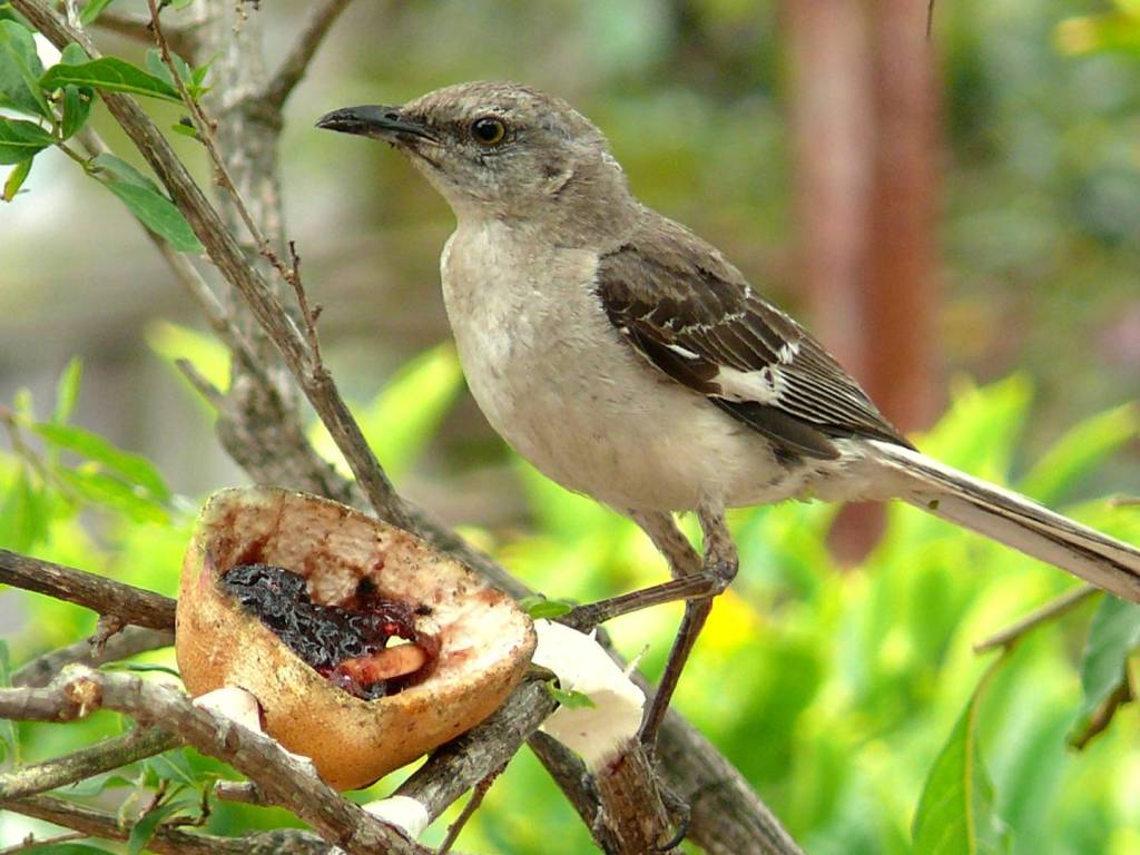 As the seasons change, mockingbirds shift their diet toward fruit. Berries, especially from native shrubs like elderberry, holly, and pokeweed, become their go-to. If you’re interested in feeding mockingbirds, planting berry-producing shrubs is a great way to attract them to your yard. They’re less likely to visit seed feeders, but they will gladly snack on chopped fruit, raisins, or suet with berries mixed in.