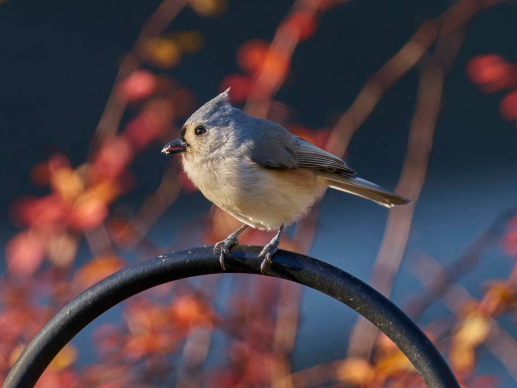 During fall and winter, they shift toward seeds and berries. That’s when you’ll see them making more frequent stops at backyard feeders. If you’re interested in feeding tufted titmice, try offering black oil sunflower seeds, safflower seeds, or suet cakes. A tray or hopper feeder works best since these birds like a solid perch while they eat.