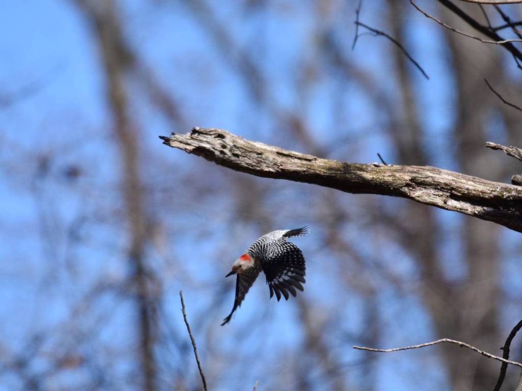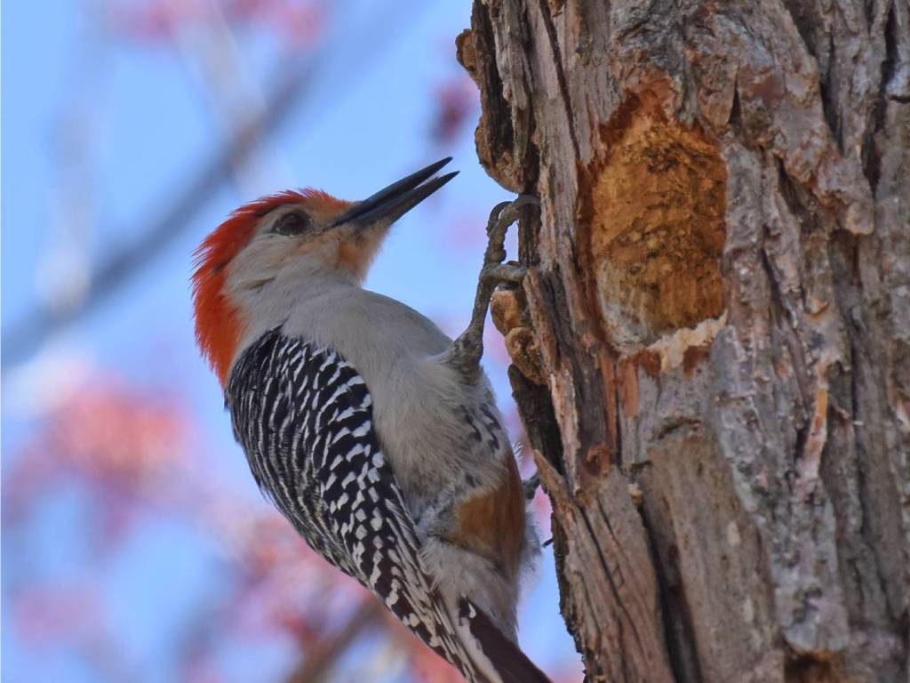 Red-bellied Woodpeckers have a few quirks that make them stand out. Like other woodpeckers, they have a specialized tongue that wraps around the back of their skulls. This lets it reach deep into cracks and crevices for insects most birds can’t access. The tongue tip is barbed and sticky, great for snagging insects.