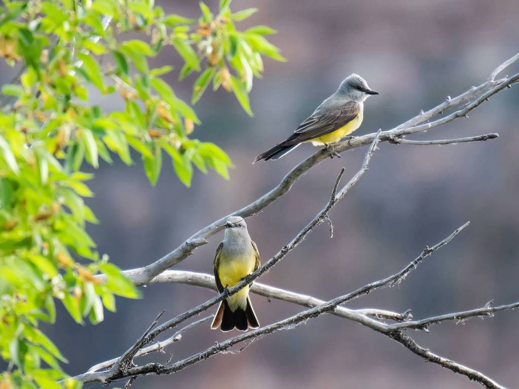 Breeding season usually begins in late spring and extends into summer. Females lay three to five eggs, which are incubated for about two weeks. Both parents feed the chicks once they hatch, bringing insects frequently throughout the day. Baby Western Kingbirds grow quickly and typically leave the nest after about two to three weeks. Even after fledging, young birds often remain near the nest site while parents continue feeding them. During this time, adult kingbirds are especially defensive, and you may notice increased chasing of other birds in the area.